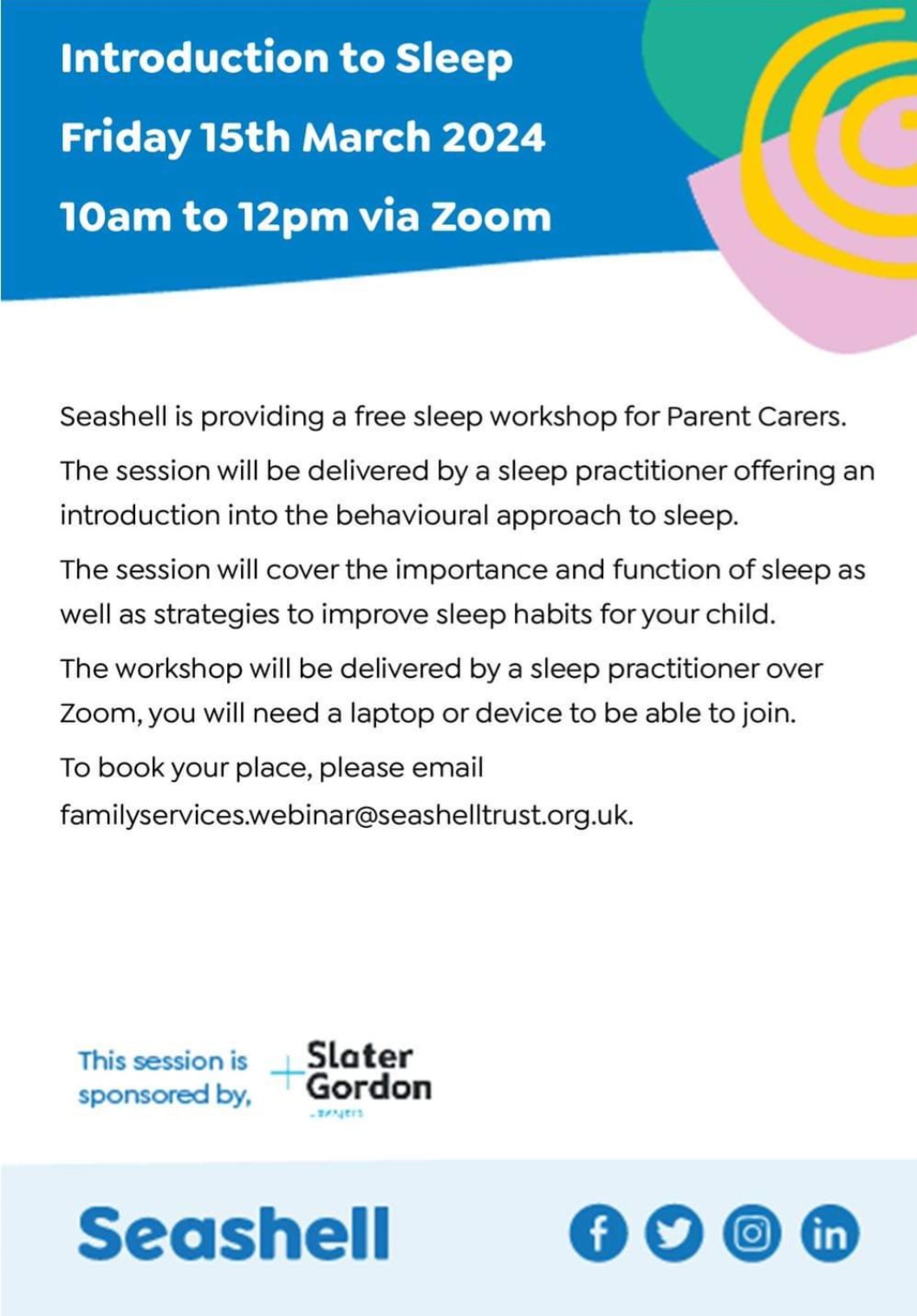 Seashell is providing a free sleep workshop for Parents and Carers on Friday 15th March 10-12noon. This will be delivered via zoom and information can be found on the attached leaflet for further information.