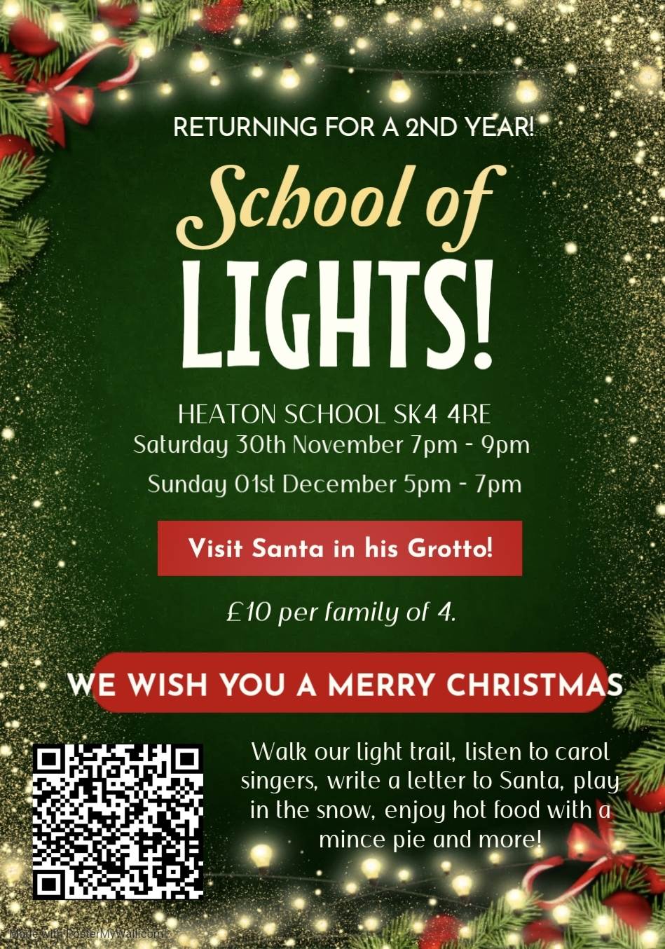 Christmas Light festival - The PTA are putting on another christmas light festival this year. Due to the success of last year we are opting to put it on for two nights instead of one. The first night will be Saturday 30th November (7-9pm) and Sunday 1st December (4-6pm) - see attached flyer.